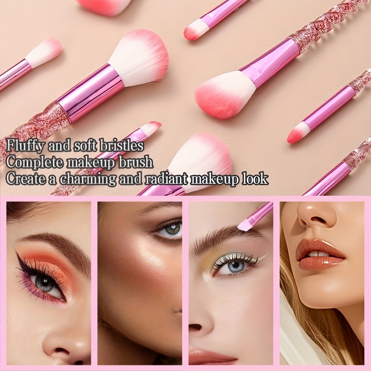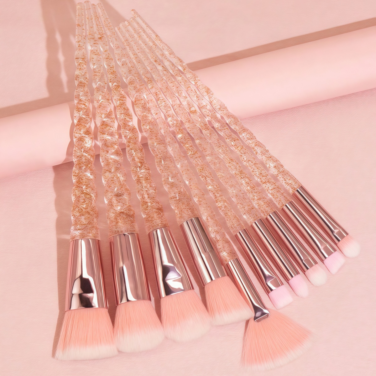 This is a unicorn – themed makeup brush set, consisting of 10 brushes in total, covering various types such as loose powder brushes, blush brushes, and eyeshadow brushes. The brush handles feature a spiral – patterned crystal – clear design, incorporated with glitter elements, looking as dreamy as a unicorn’s horn. The brush heads are mainly made of pink – white gradient artificial fiber hairs, which are soft and fluffy, have strong powder – grabbing ability and don’t absorb powder, and can be adapted to beauty products of different textures such as powder – based and cream – based ones.