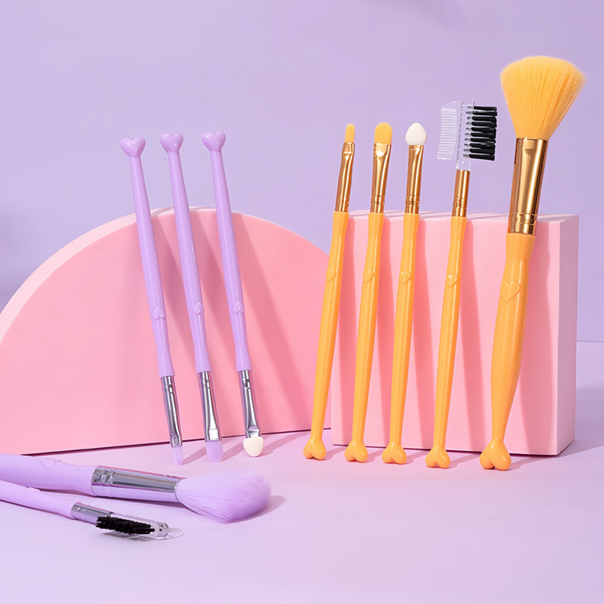 This is a set of 6 – piece makeup brushes, each serving distinct functions. Packaged in a transparent plastic bag for easy display, the brushes feature cute heart – shaped handles in a soft orange hue, with metal ferrules adding a touch of sophistication. They come in various sizes: the largest fan brush measures 20.5cm, ideal for large – area setting powder application; there are also an eyebrow brush (16.5cm) and eyeshadow brushes (15.5cm, 14.5cm, etc.). Suited for daily makeup, they meet different needs for eye and facial makeup, offering good cost – effectiveness to help create a refined look.